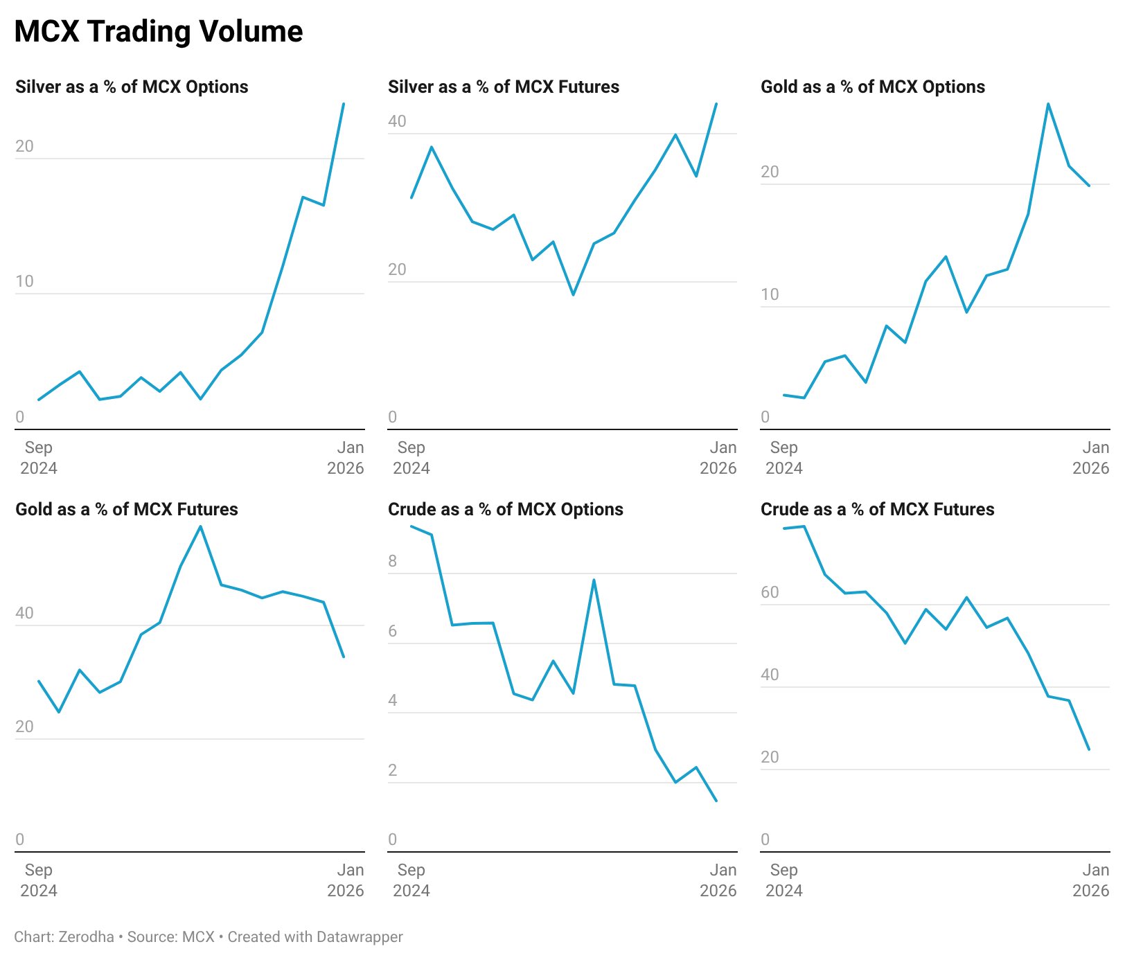 But that’s changed dramatically, thanks to the spectacular rally in gold and silver. If you look at gold and silver as a percentage of total MCX trading volumes today, the numbers are kind of crazy. A lot of this increase has come at the expense of other commodities like crude.