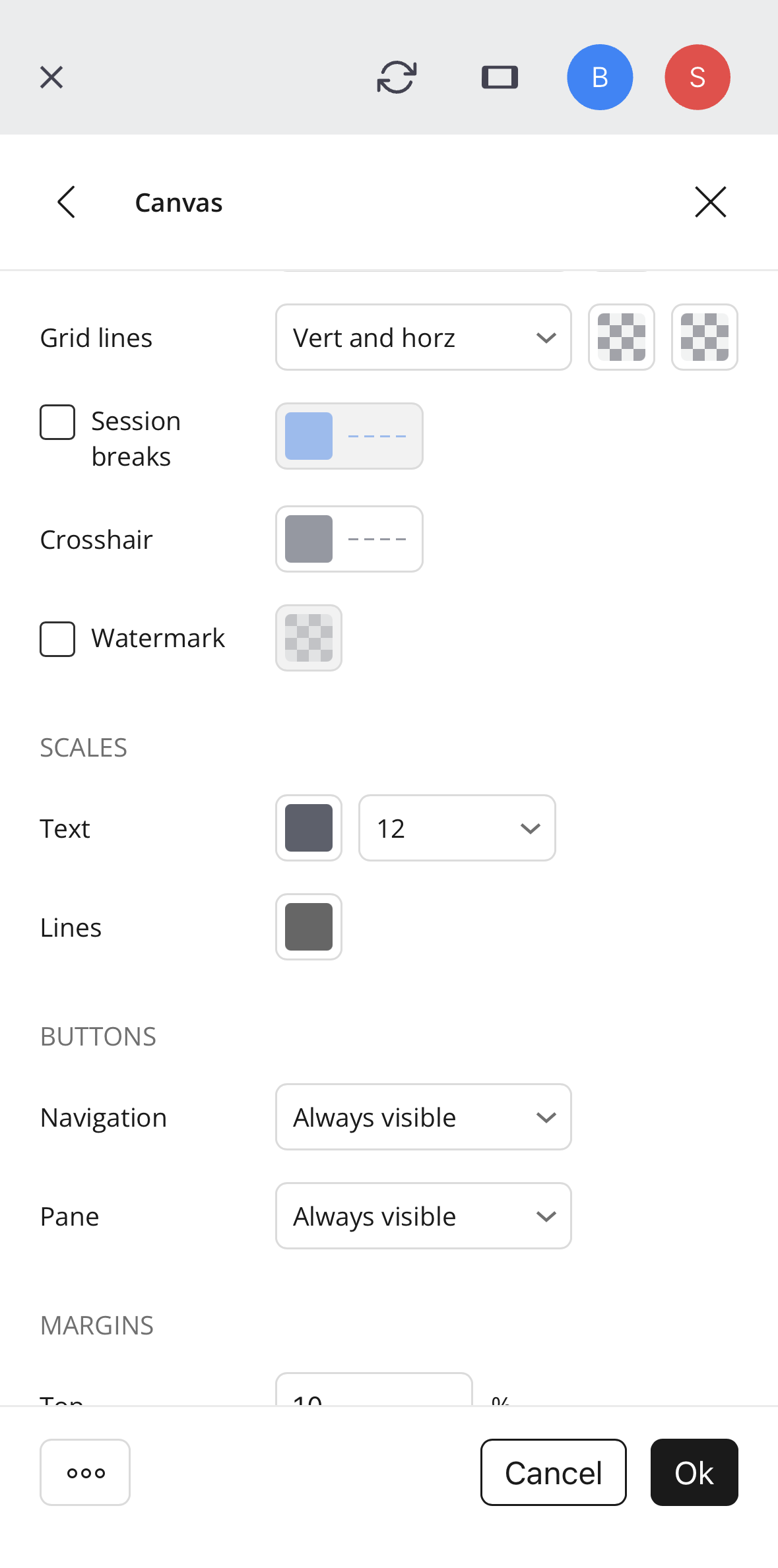 Zoom in/out can be done using the two-finger pinch/expand gesture. To enable the reset button. Open the settings available on the top-right of the charts > click on canvas > Under buttons select the option as Always visible on both Navigation and Pane.