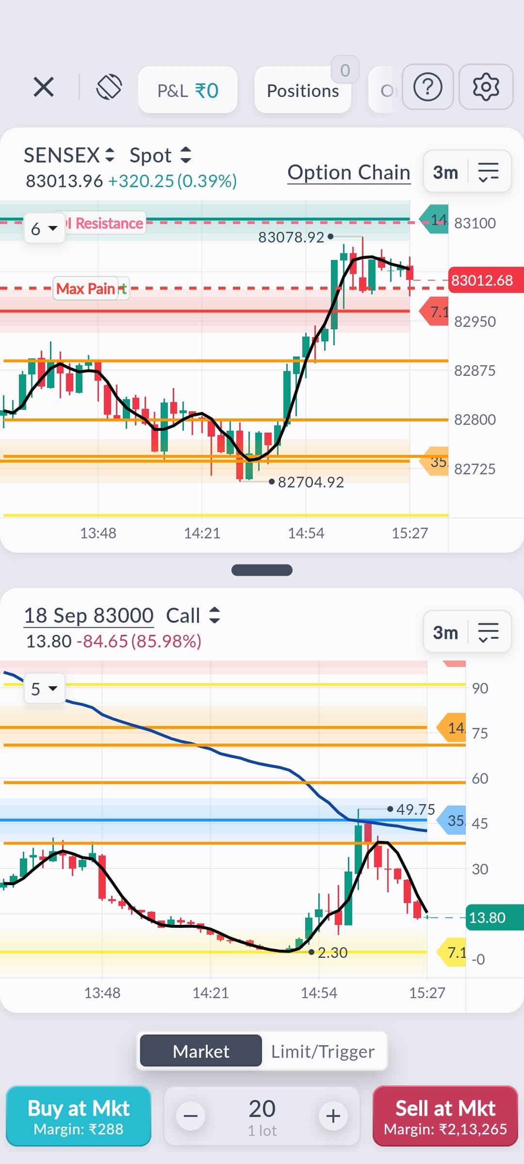 after multiple extra clicks we open multiple chart layout index + options or only options chart for trading. both option buying and selling. only the active layout has buy/sell button visible, we have to click other layout then we can see buy/sell button. then we can create entry for that script.