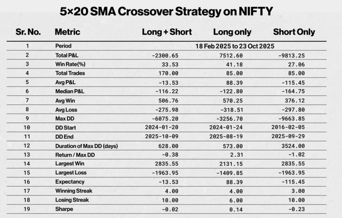 In short, the parameters and timeframes shown in the backtest may not be perfect for the Nifty. Every asset has its own personality — some trend cleanly, others move in choppy cycles, and even strong trends can vary in pattern and structure.