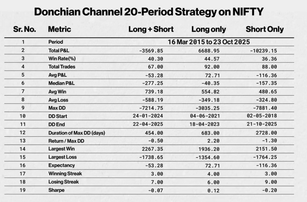 So yes, Donchian 20 on a daily timeframe on Nifty fails badly.