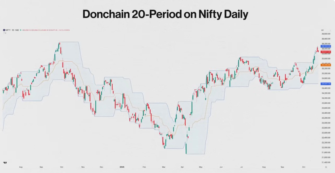 Let’s examine how both indicators perform when applied to the Nifty daily timeframe, just the way Donchian did.