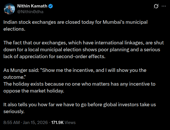 Agree to the Munger quote on incentives, and thinking about it - off day means no trades and no brokerage revenues - so the reason for Nithin’s frustration is kind of being explained by his own tweet I feel. Again no disrespect, I’m a big fan, but this seemed unnecessary. It was a planned holiday after all and notified well in advance.