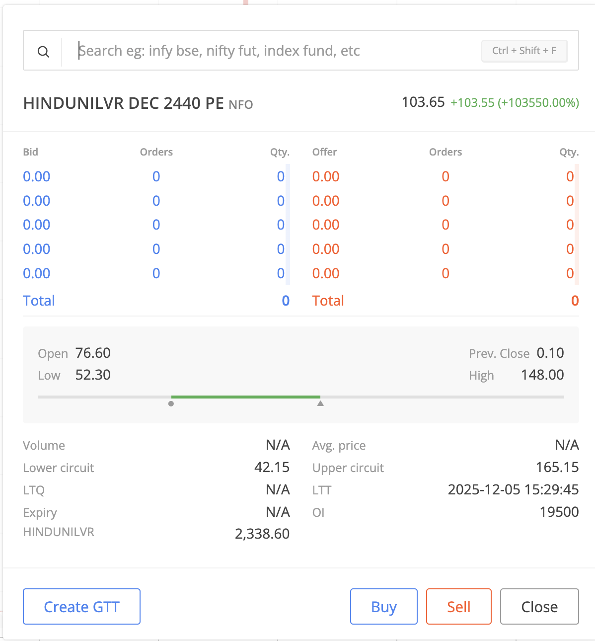 On December 5, the HINDUNILVR DEC 2440 PE option showed a price jump of +103,550% in a single day — from ₹0.10 to ₹103.65 — even though the option started trading only around 10:00 AM instead of 9:15 AM.