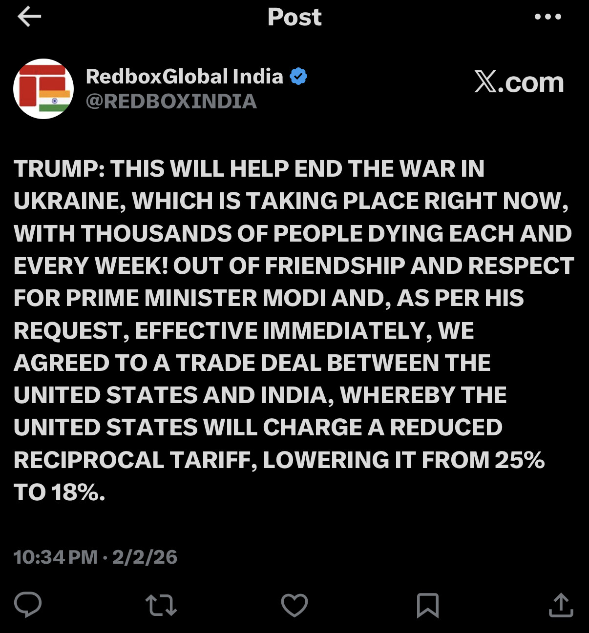 Trump lost first mover advantage to europe , Uk and others so he rushed in to make a deal with india, everything he wrote in tweet about india giving up russian oil etc is BS, that tweet is lying himself to feel better.