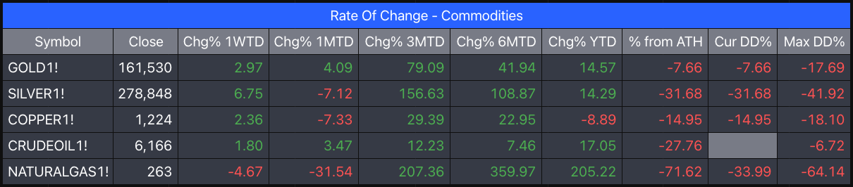 Commodities continue to hold up and move broadly in line with expectations. Precious metals and copper were all in the green this week: