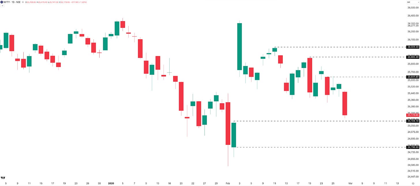 The week saw two –1%+ sessions — Tuesday and Friday — while the remaining three days printed green candles. Monday showed early promise with a gap-up and intraday high of 25,770, but Tuesday’s candle broke last week’s low, and Friday finished the job.