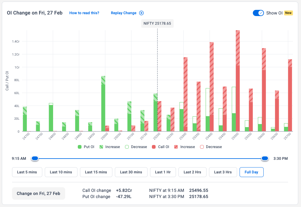 Rising OI is visible at the 25,300, 25,400, and 25,500 CE strikes. On the PE side, only the 25,000 strike shows meaningful OI. The street appears positioned for a bearish move on Monday, though OI can flip within minutes, so nothing definitive should be read into this. Broad takeaway: 25,000 as support, 25,500 as resistance — with Monday’s 0DTE price action being the real arbiter.
