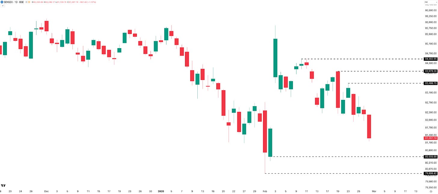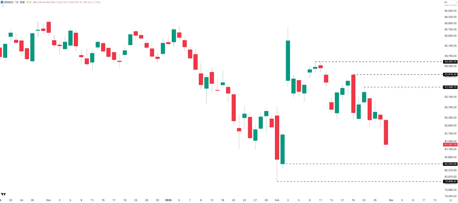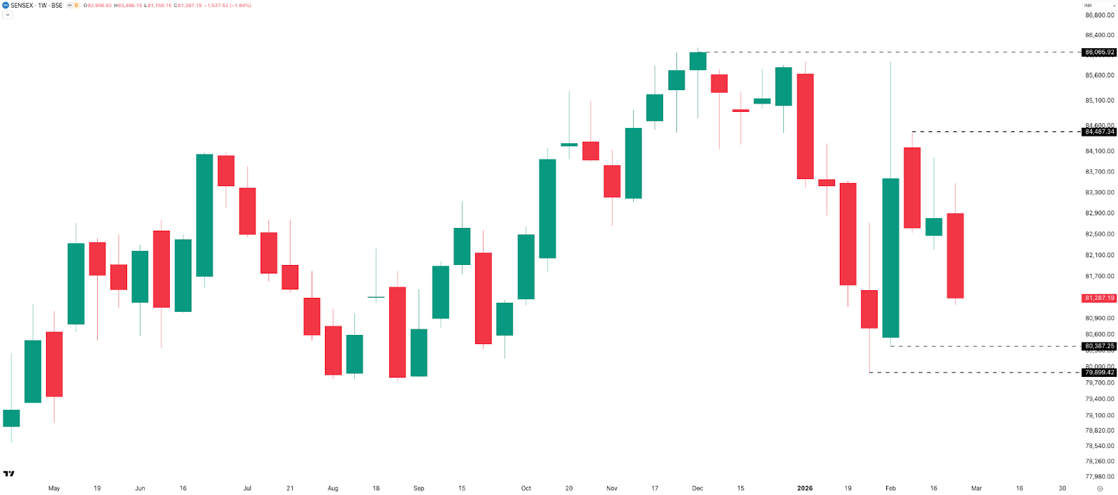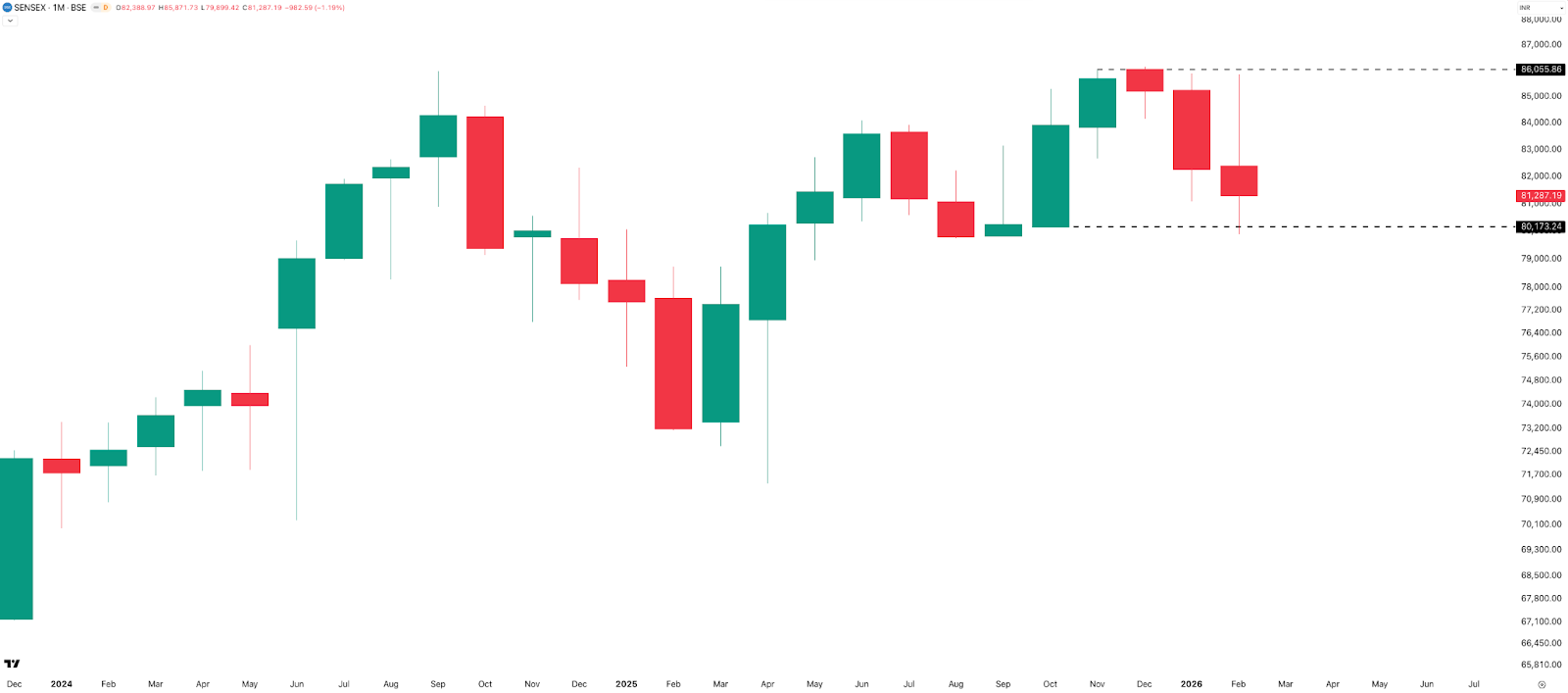 The SENSEX monthly chart mirrors NIFTY’s structure closely. It made a near-7% monthly range of roughly 6,000 points and closed at 81,287 — down 983 points (–1.19%) from January. Key levels: 86,000 as resistance, 80,200–80,000 as support.