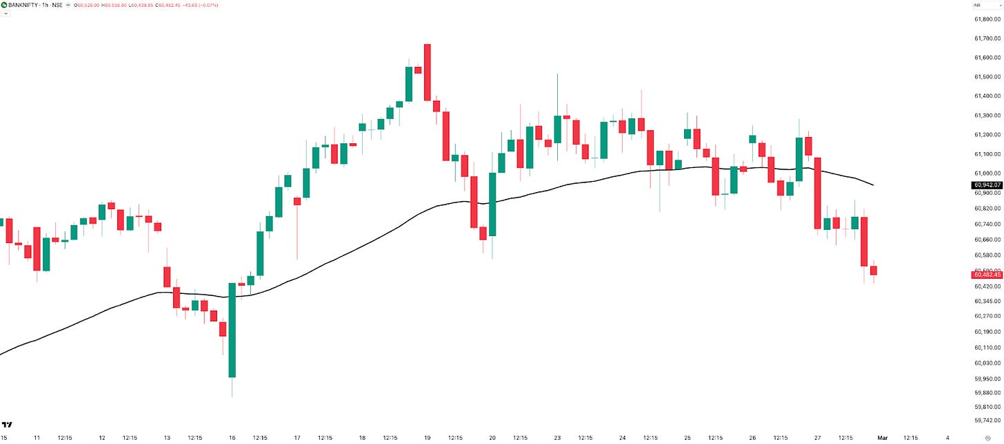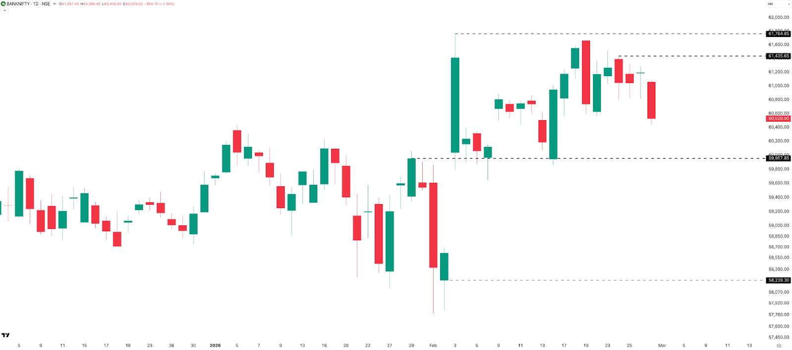 Here’s an interesting divergence: while NIFTY remains in the red YTD, BANKNIFTY gained 1.54% in February to close at 60,529 — its highest monthly close ever. Both months of 2026 have been positive for BANKNIFTY, even as the broader market zigzags.