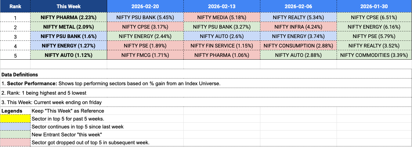 Top performers this week: PHARMA (+2.23%), METAL (+2.09%), AUTO (+1.12%), PSU BANK, and ENERGY.