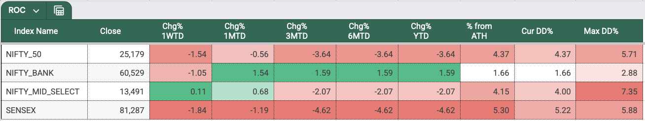 Year-to-date, only BANKNIFTY (+1.59%) remains in the green. January and February have historically been negative months for Indian equities, and 2026 is staying true to that pattern. Based on current price action, a broad trend reversal doesn’t appear imminent.
