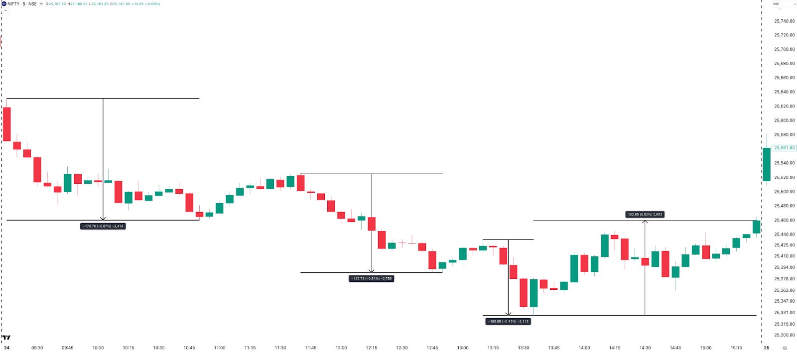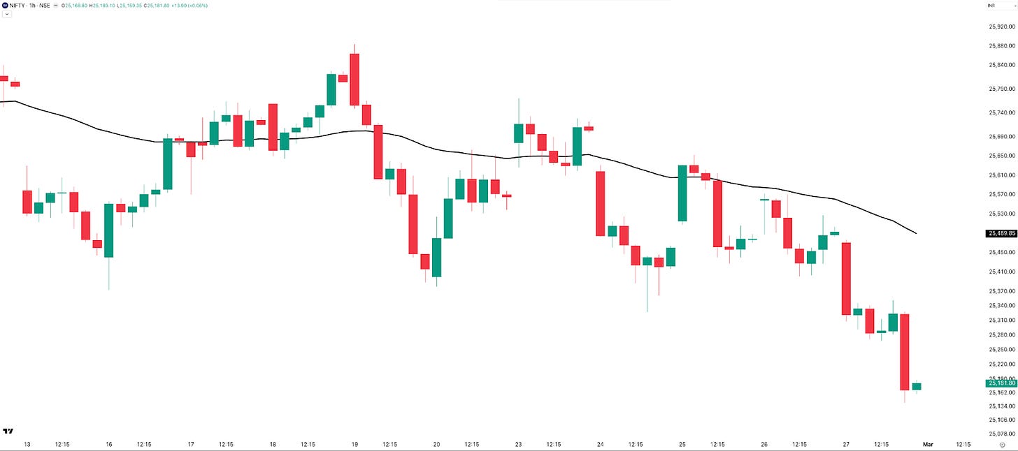 After an 80-point gap-down open, NIFTY continued lower through the session without meaningful pullbacks, save for a ~130-point bounce post 1:30 PM. The ATM straddle opened at 135 points and stayed relatively contained. NIFTY ended the day down 288 points (–1.12%) — a good day for directional option sellers and buyers alike.