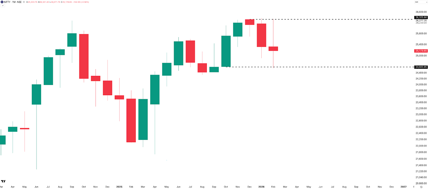 February was quite a month for NIFTY. It tested the October 2025 low on Budget Day (1-Feb) and then almost touched its all-time high following the India–US trade deal news on 3-Feb. The monthly range clocked in at a whopping 6.7%, or 1,770 points — the highest since April 2025 (that tariff-bomb month). Despite all that drama, NIFTY closed down just 0.56%, or 142 points, from January’s close.