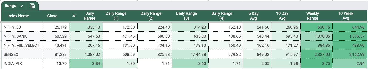 NIFTY’s 5-day average daily range dipped from 296 points last week to 242 points this week, though Tuesday and Friday both printed 300+ point ranges. All three Fridays over the past three weeks have featured large moves — could be recency bias, or just Fridays being Fridays.