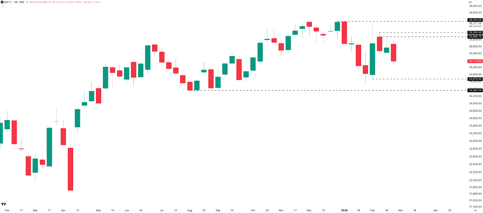The monthly structure remains sideways to bearish. Budget Day low of 24,570 acts as support; ATH of 26,375 is the resistance to watch.
