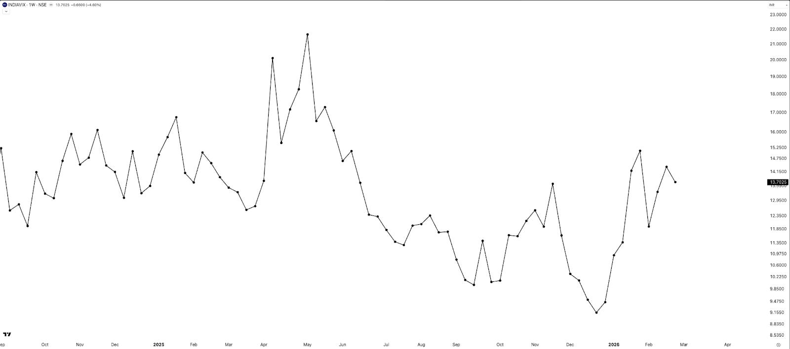 INDIAVIX fell 4.6% to close at 13.7 for the week. Despite this, 0DTE NIFTY straddle premiums remain above 200 — likely a function of the weekend ahead rather than any underlying vol concern. Nothing material to read into here.