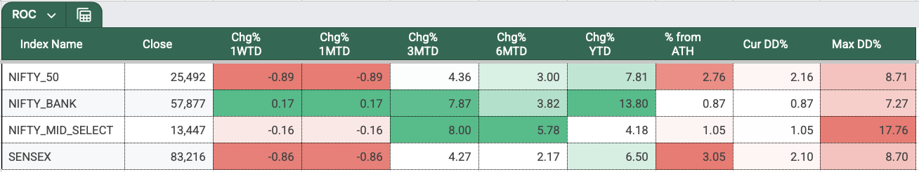 In terms of proximity to their all-time highs (ATH)—BANKNIFTY is the closest, just 0.87% away, followed by MIDCPNIFTY, which is about 1% away, while NIFTY and SENSEX are roughly 3% below their respective ATH.