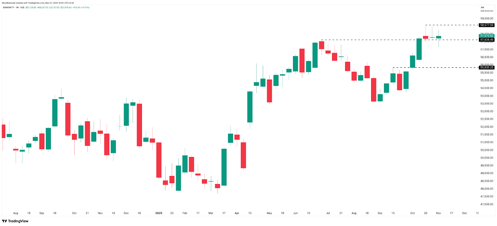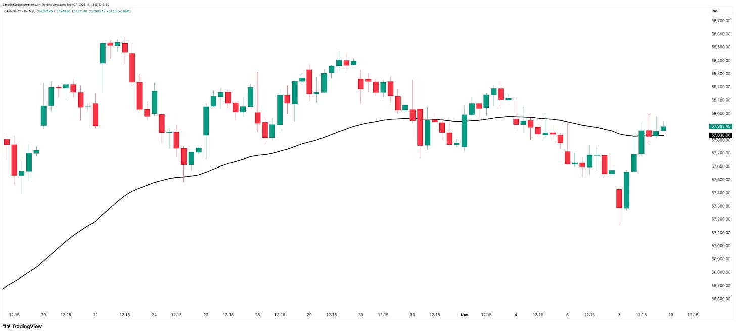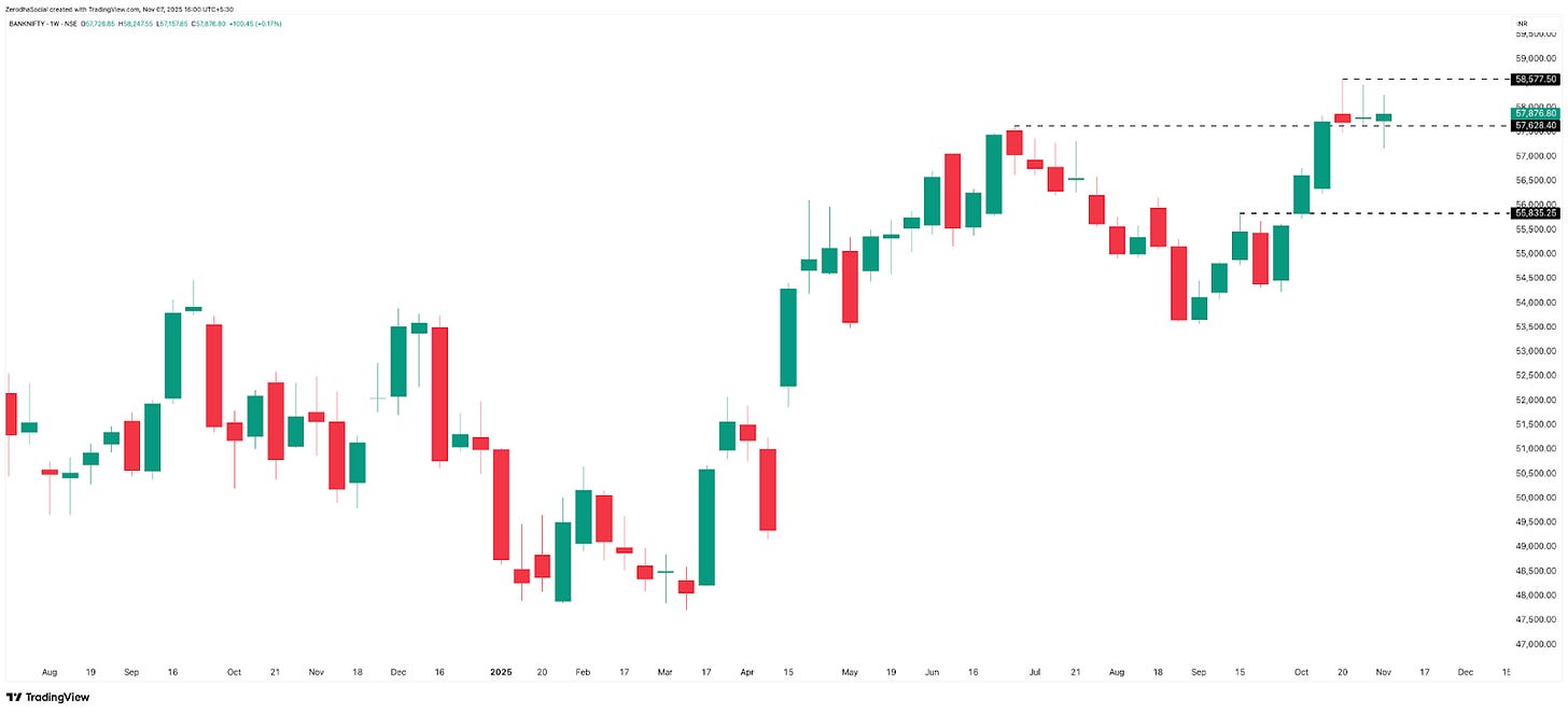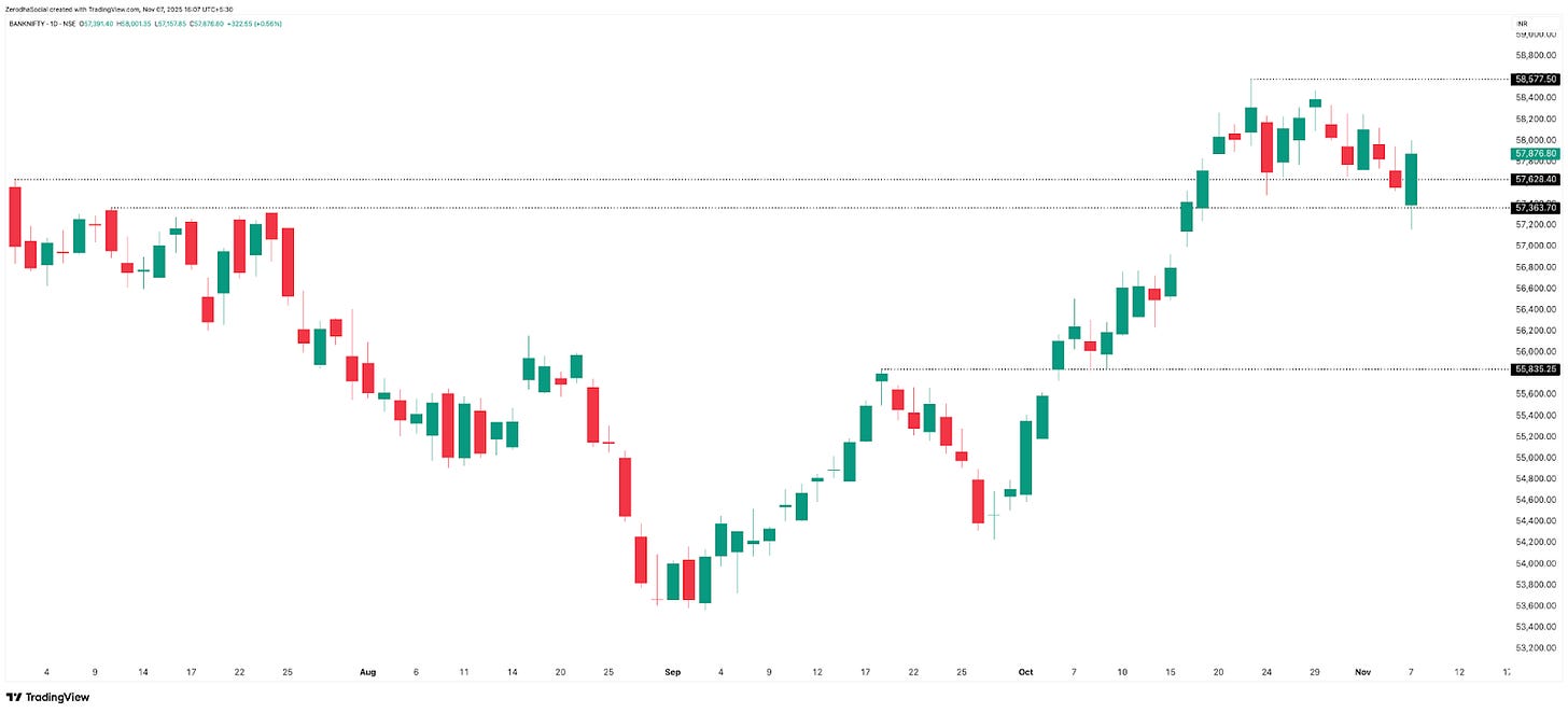 For this week specifically, BANKNIFTY added around 100 points, or +0.17%, and closed at 57,877. During the week, it made a low of 57,157, but on Friday, we saw a decent recovery—the index moved about 844 points higher from the low, roughly a 1.5% bounce.