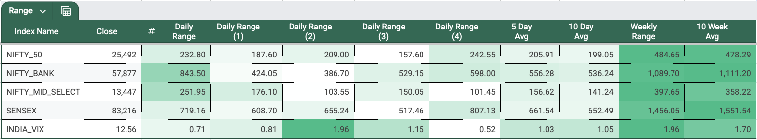 NIFTY’s 5-day average range continues to hover around 200 points, which is similar to last week and also matches the 10-day average range. Interestingly, all major indices had their highest range day on Friday—just like last week.