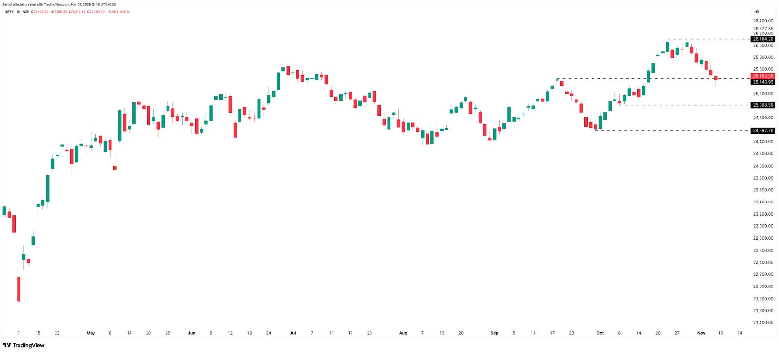 NIFTY is again hovering around the crucial support level of 25,450. Out of the four trading sessions this week, NIFTY has closed three days in the red, with only Monday closing positive.