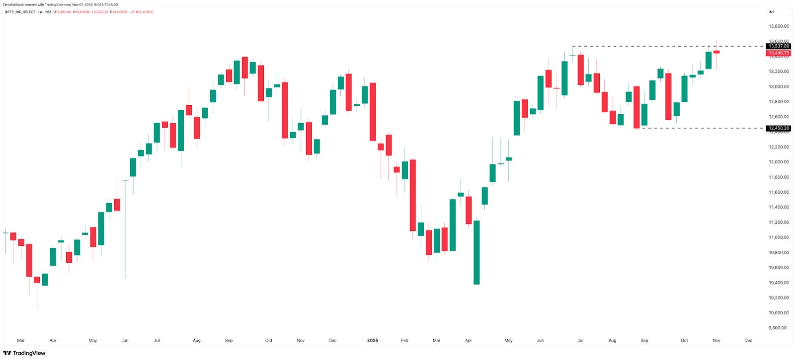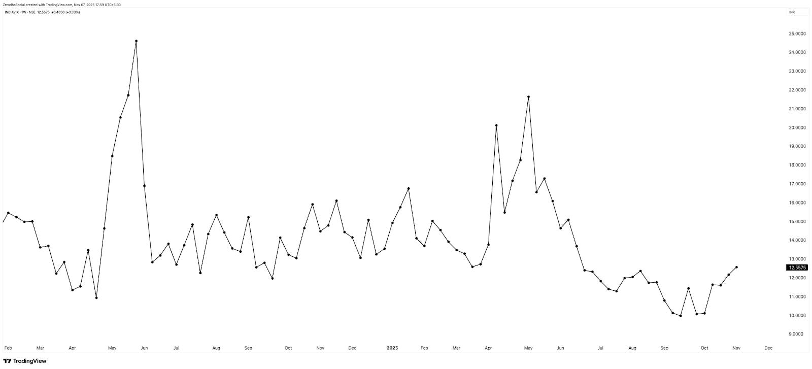 INDIAVIX continued to inch higher, rising 3.33% this week to close at 12.56. It has been steadily moving up since the start of October, climbing from 10.06 to 12.56—that’s nearly a 25% increase.