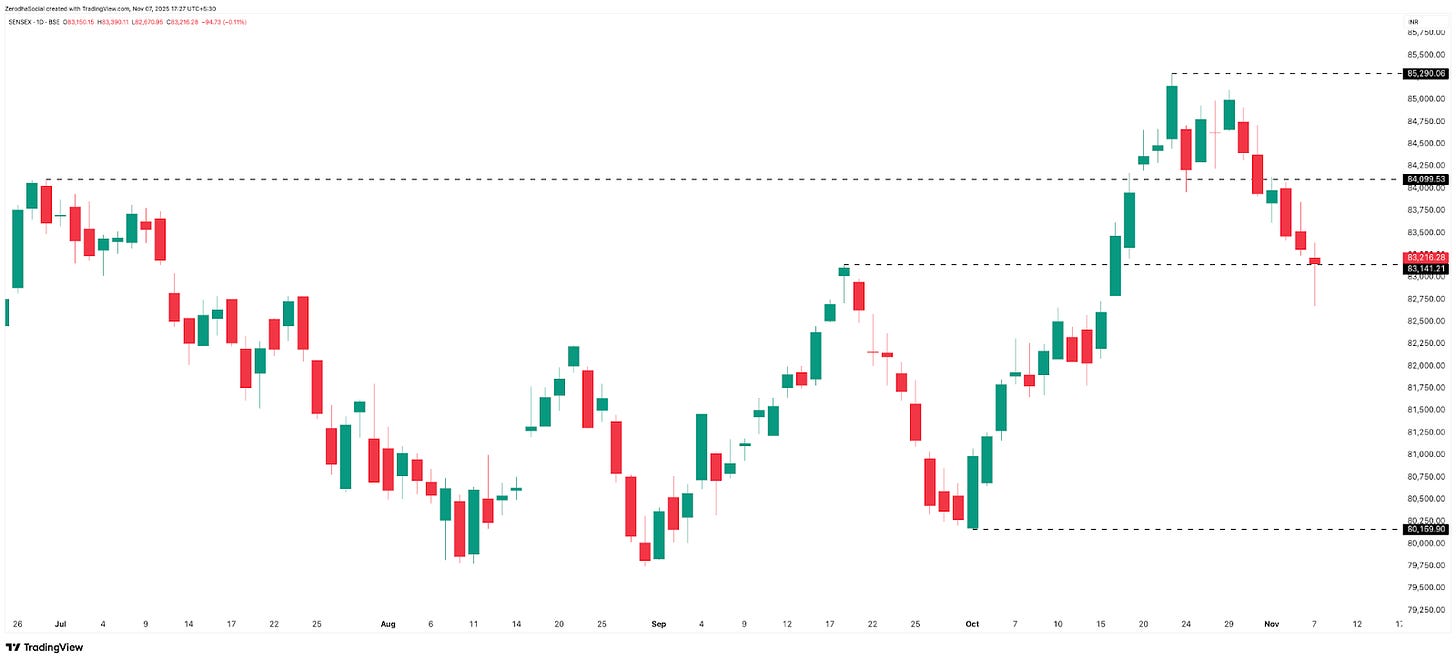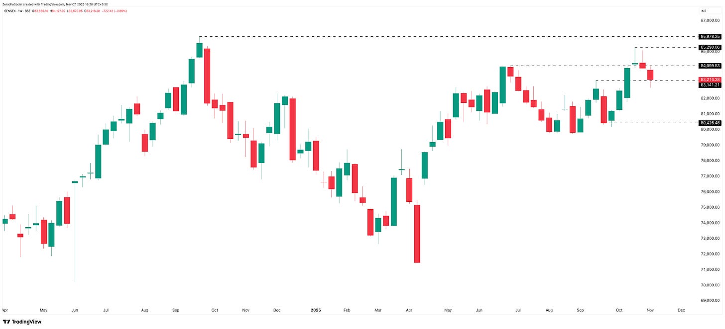 With two back-to-back red weekly candles, the index lost 722 points, or about 0.86%, to close at 83,216 compared to last week’s close. It tested and briefly breached the support around 83,150, but managed to close back above it.