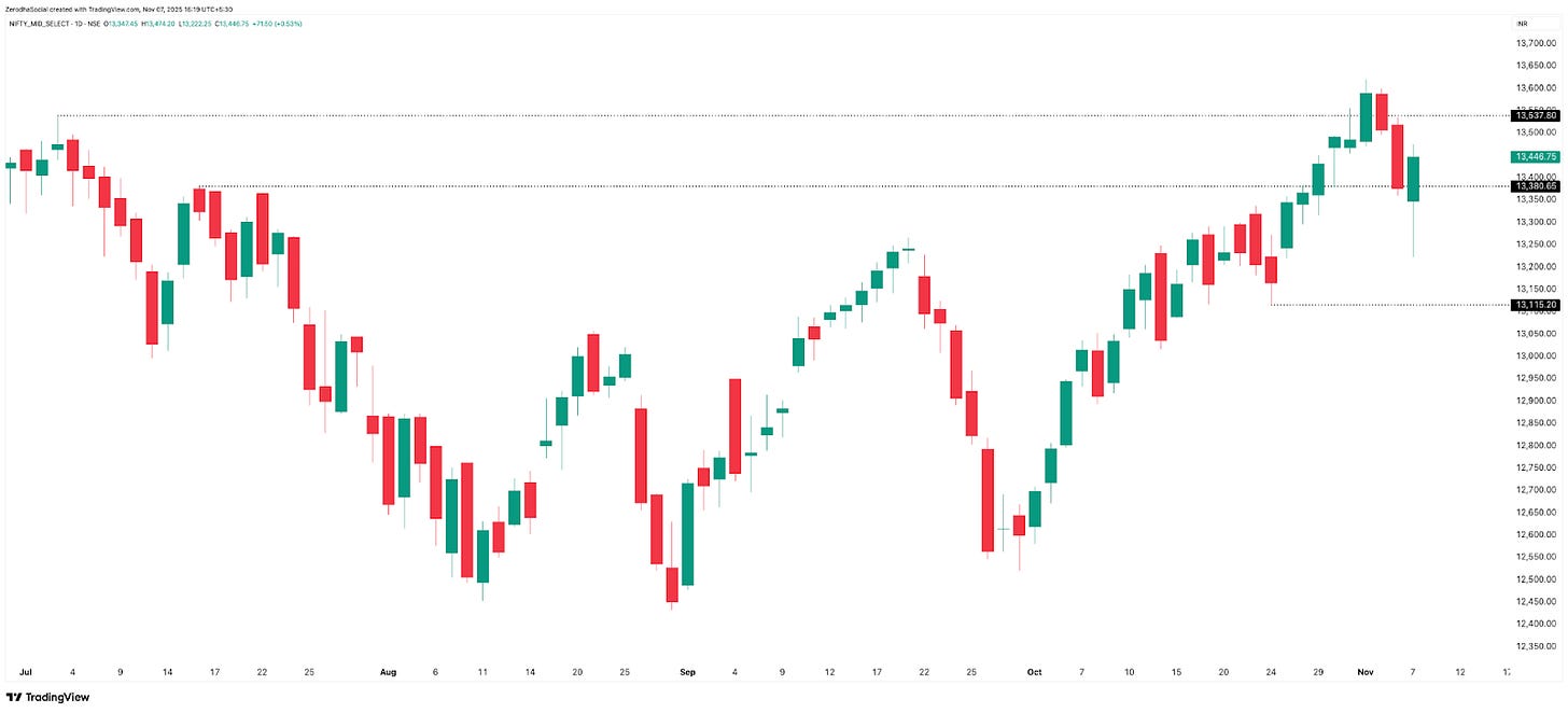 Just like BANKNIFTY, the two red candles of Tuesday and Thursday were sandwiched between the green candles of Monday and Friday, with Friday showing some signs of recovery. Whether Friday’s upmove carries forward or fades out—we’ll know in the coming week.