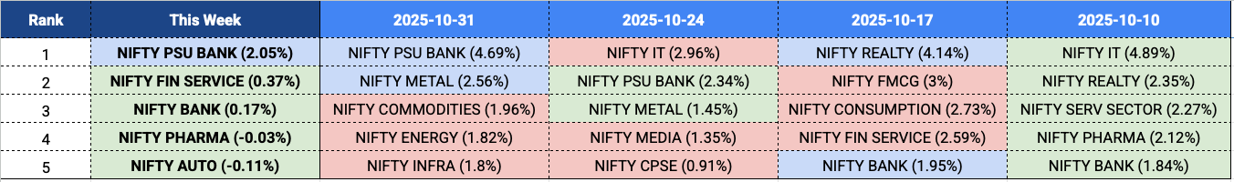 PSU Banks have remained in the top five sectors for three consecutive weeks, securing the top spot both this week and the previous one. PSU bank stocks rallied, following reports that the government is preparing a new plan to merge certain public sector banks and privatise smaller lenders.