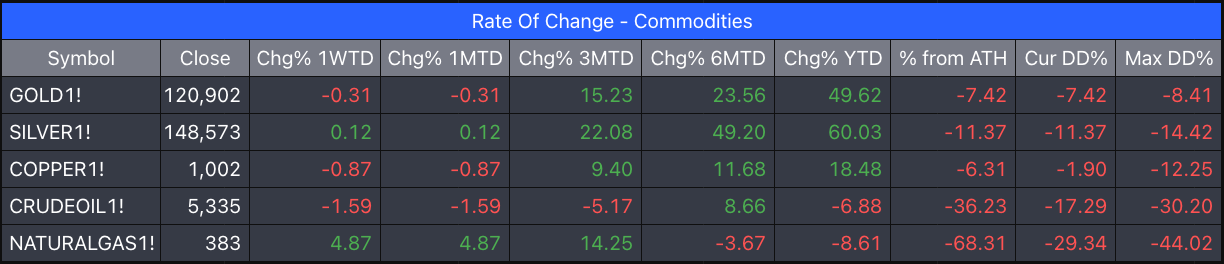 Overall, precious metals continue to hold strength, base metals are steady, and energy remains mixed, with Natural Gas leading the commodity space this week.