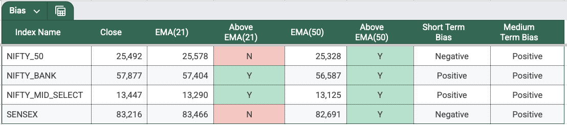 This week, NIFTY and SENSEX have seen their short-term bias turn negative, as both indices dropped below the 21 EMA on the daily timeframe. However, the medium-term bias—based on price relative to the 50 EMA—still remains positive.