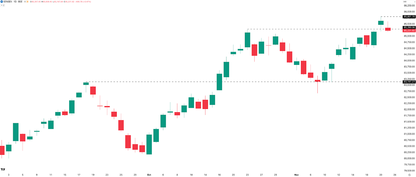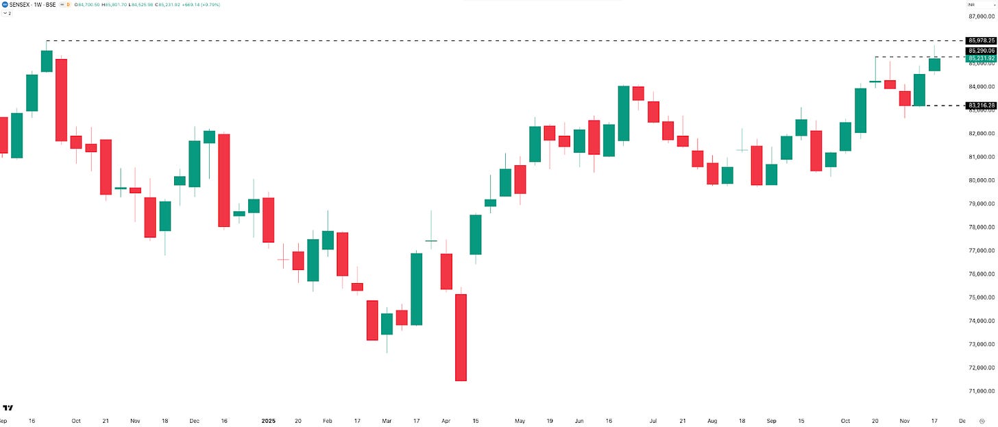 The chart looks very similar to NIFTY. It missed a new ATH by just 176 points, or 0.21%, after hitting a weekly high of 85,802. Sensex added 669 points this week, up 0.79%, to close at 85,231—its highest weekly close since September 2024. That also makes it two straight green weekly candles.