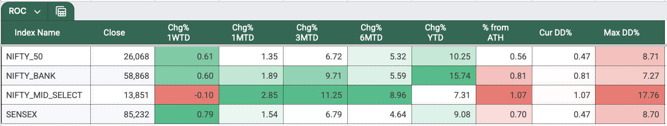 All four indices are now just 1% away from their all-time highs. Year-to-date, NIFTY has finally hit double-digit returns at +10.25%, while BANKNIFTY remains the top performer with a solid +15.74%. SENSEX is up 9%, and MIDCPNIFTY lags at +7.31%—making it clear that 2025 wasn’t a mid-cap year.