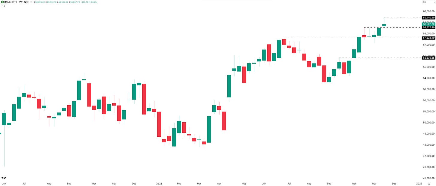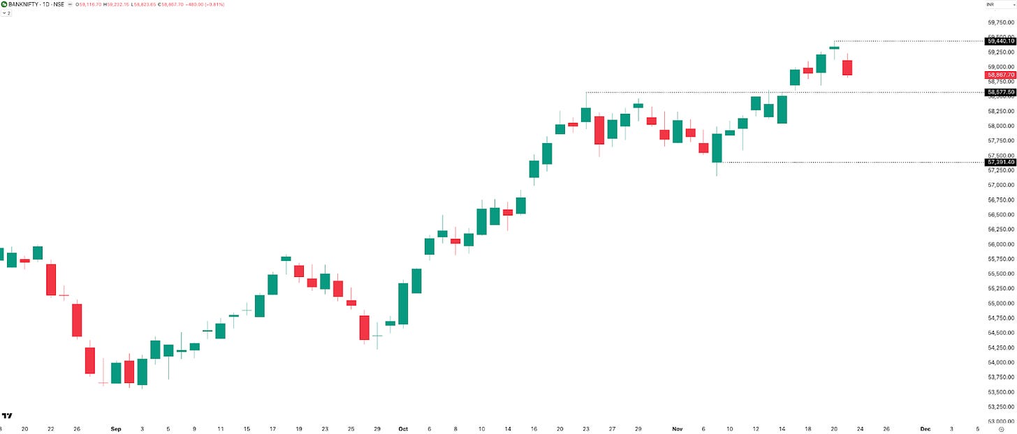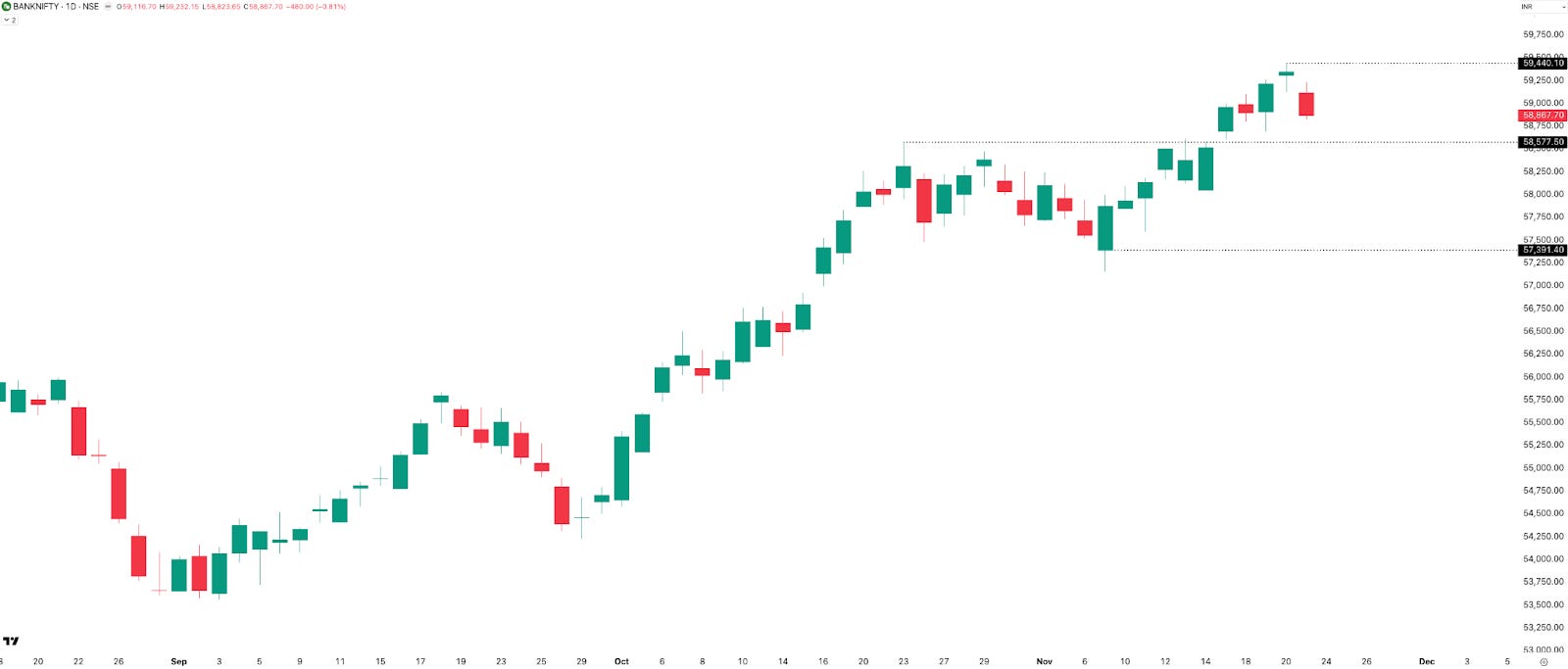 Key levels remain the same as the weekly chart: support near 58,600 and resistance at 59,440. Just like last week, BANKNIFTY hit a new ATH on Thursday, only for Friday to drag it back down. But unlike last week, Friday’s last-hour price action wasn’t very encouraging this time.