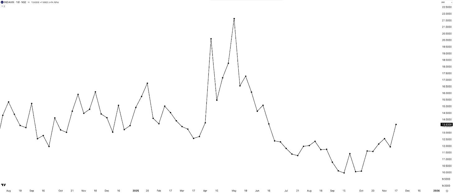 INDIAVIX jumped 14% this week, closing at 13.63—and the rising NIFTY straddle premium heading into the monthly expiry reflects the same tension. From the bottom of 9.96 in September 2025, VIX has now risen 37% in just two months.