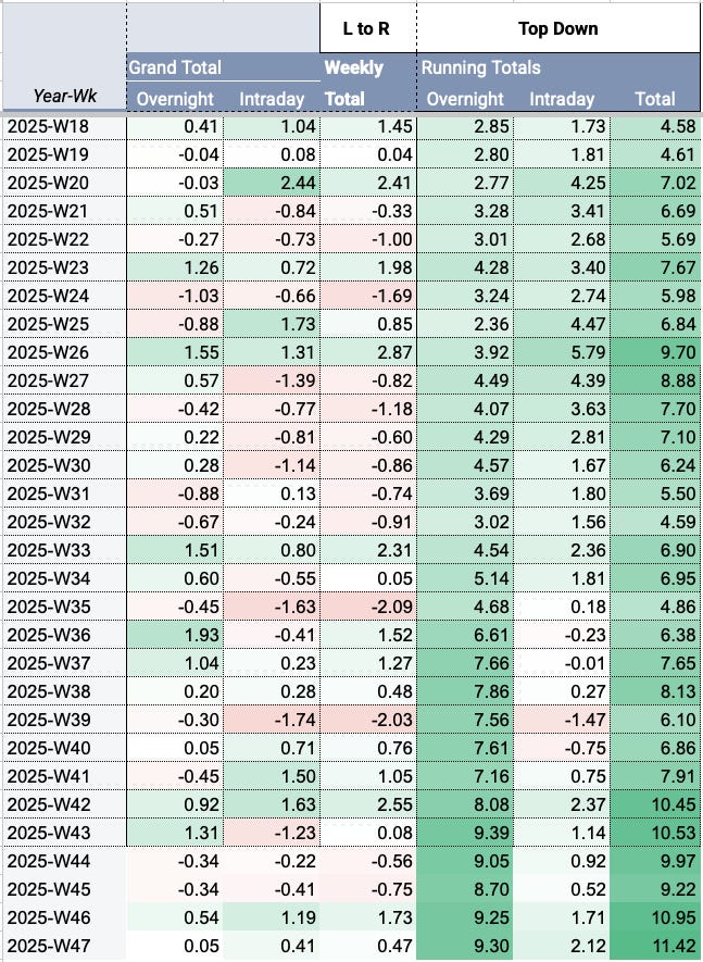 So far, after 47 weeks in 2025, NIFTY has gained +9.30% from overnight moves and only +2.12% from intraday moves.