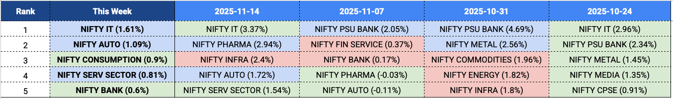 IT continues to lead for the second week in a row, with AUTO and SERVICES also carrying forward their strength from last week. Two new entrants are CONSUMPTION and BANK.
