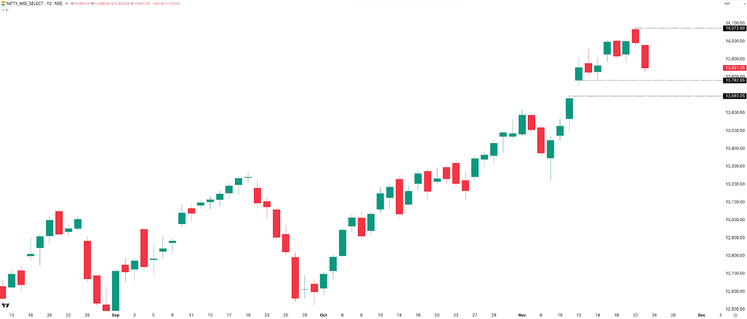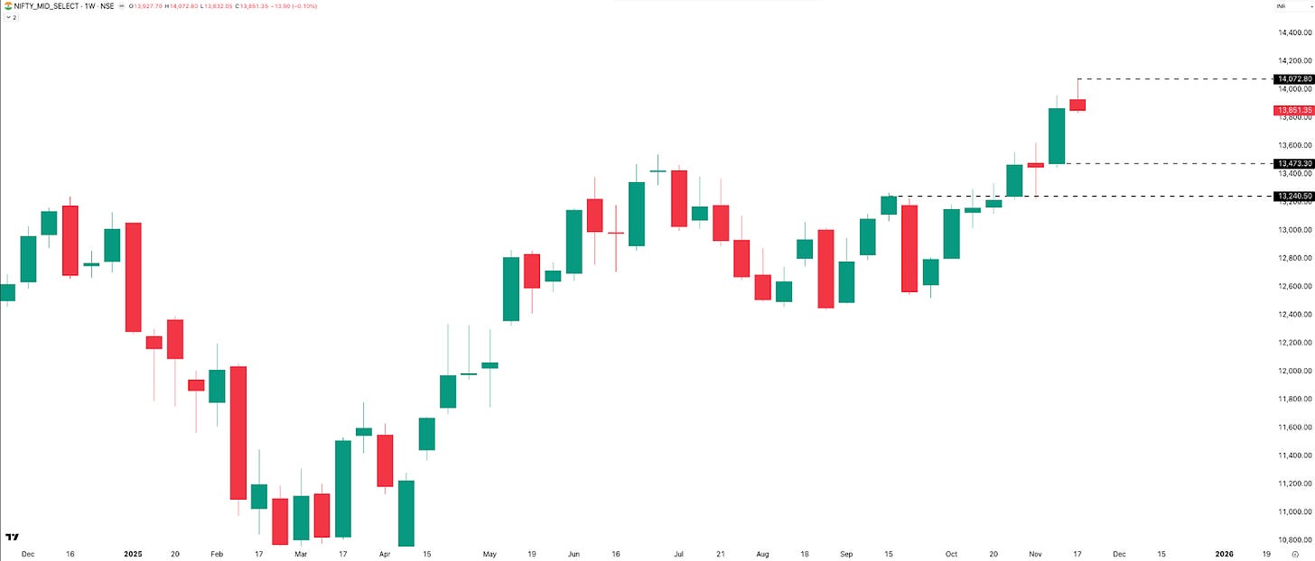 MIDCPNIFTY hit a new all-time high this week—just like BANKNIFTY—marking two weeks in a row of ATHs. But it couldn’t sustain the momentum, closing the week with –14 points, or –0.10%, at 13,851.
