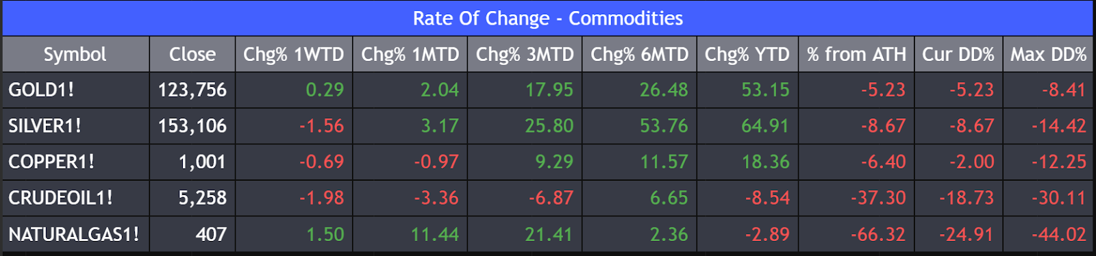 Silver dipped slightly but remains the strongest performer this year, with major gains over the last six months and nearly 65% YTD, despite being 9% off its peak.