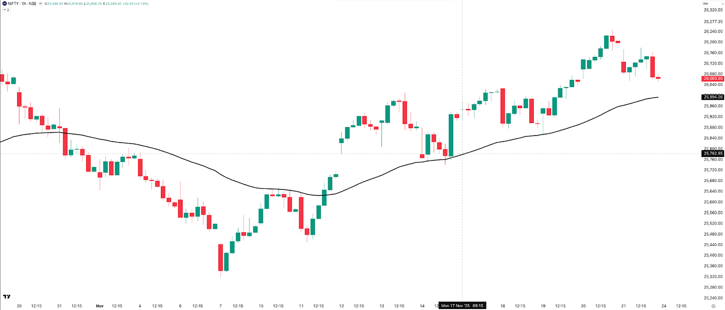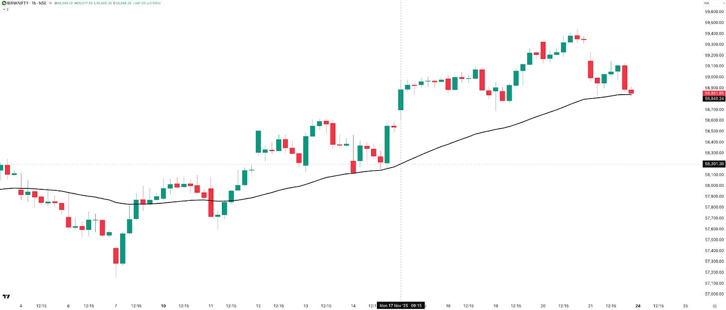 In fact, NIFTY has been holding above the 50 EMA since 11th November—that’s 11 straight calendar days of strength. The hourly bias remains positive, and hopefully, the price continues to push higher.