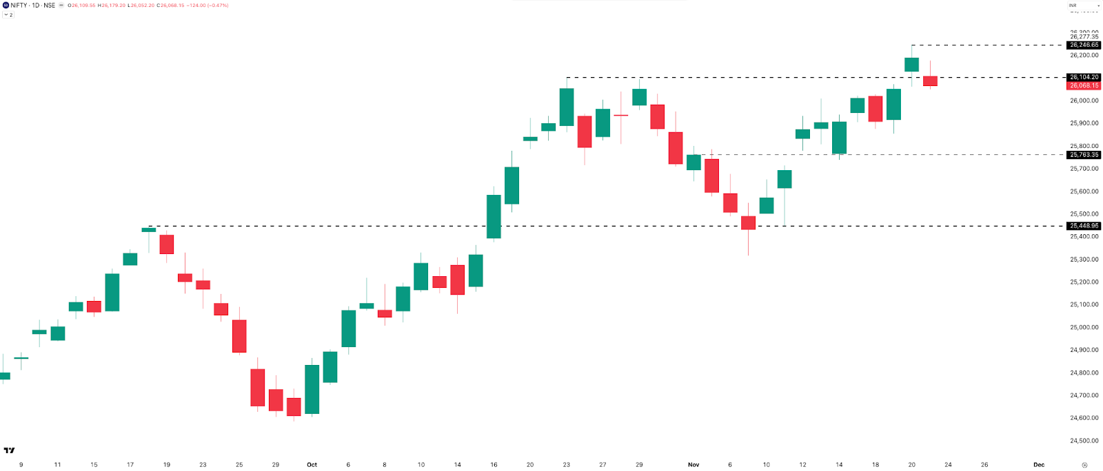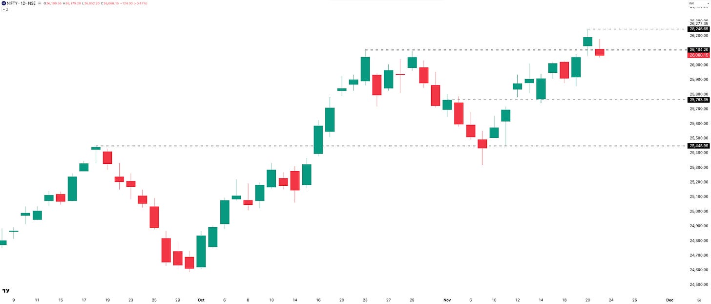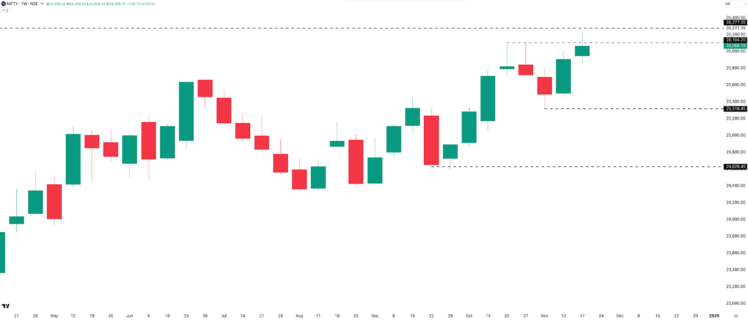 NIFTY printed three green candles and two red candles this week. Thursday’s gap-up and strong early momentum had everyone thinking a new ATH was finally coming… but the post-2:30 PM sell-off—followed by Friday’s dip—pushed that moment a little further out.