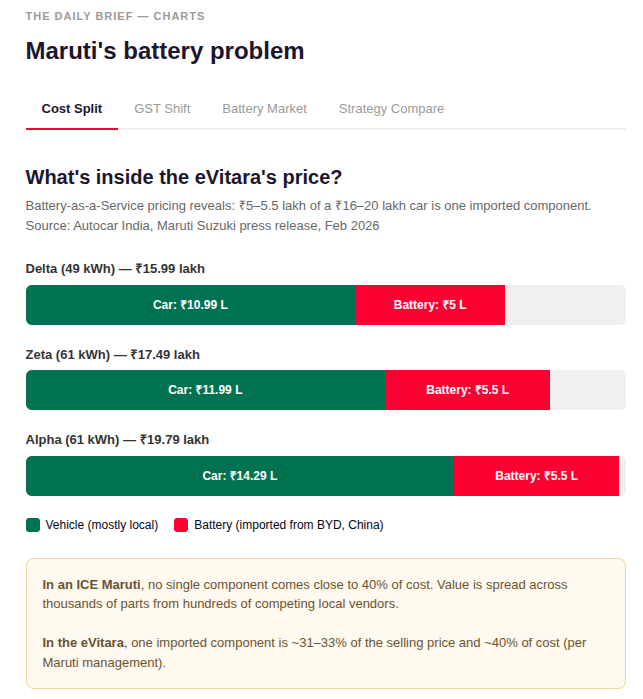 In a petrol car, the entire powertrain, engine, gearbox, fuel system, exhaust, accounts for roughly 18% of the car’s cost. But this flips completely in the case of EVs. Maruti imports the core finished battery from one single vendor — BYD. Its old playbook doesn’t help it here.