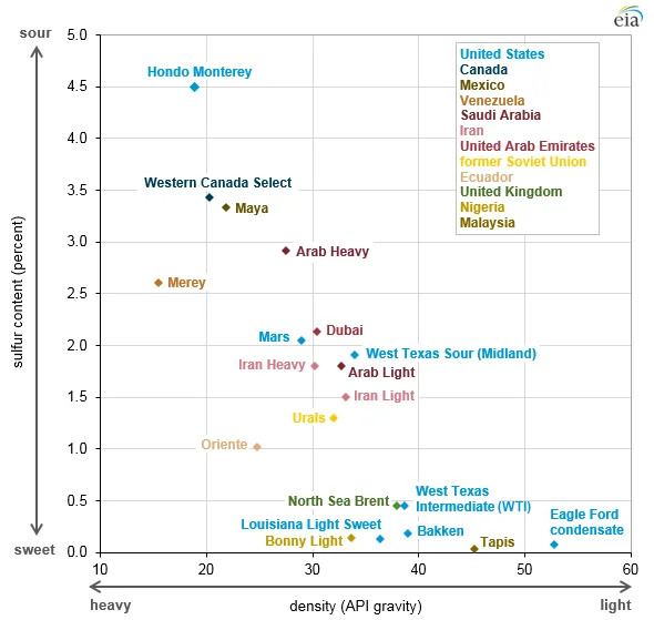 The second is sulphur content — whether the crude is sweet or sour. Sweet crude has very little of it and requires less processing. Sour crude, though, is loaded with sulphur and needs to be treated before use. We covered this briefly in our story on Venezuelan oil.