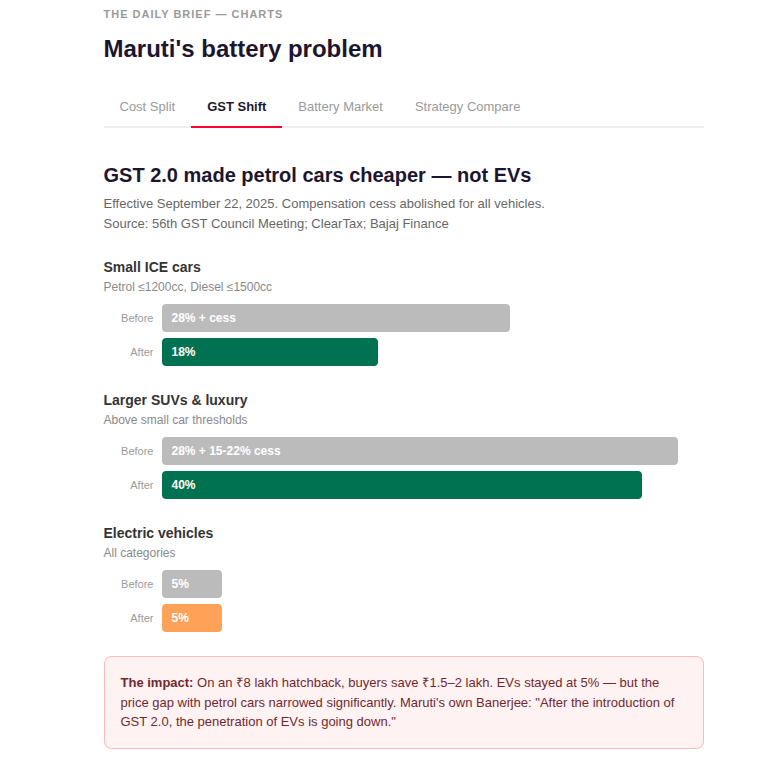 So Maruti was juggling multiple things that hit its profitability at once: it was importing expensive batteries, it was pricing its cars aggressively to undercut rivals, and a tax reform had just made petrol cars significantly cheaper. Meanwhile, its customer base still mostly treats EVs as a second vehicle.