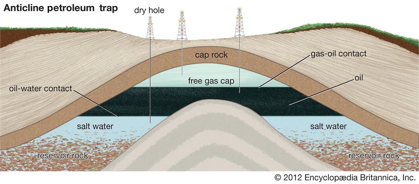 Now, crude oil isn’t the only thing hiding underground. In many of the same reservoirs, sitting above the oil layer, there’s a gas. Since gas is usually lighter than liquid, it floats on top, like air above water. That’s natural gas, and it’s a separate thing from crude oil, even though the two are neighbours underground and often discovered together.