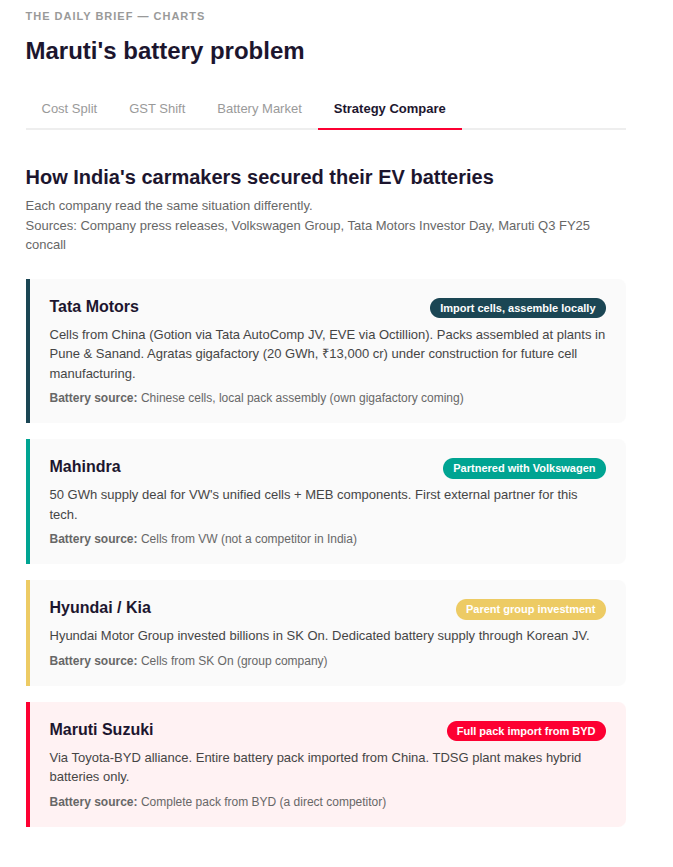 These competitors have more control over their battery costs by virtue of having their own local battery-pack assembly or stronger battery integration. While importing battery cells from Chinese suppliers Gotion and EVE, Tata assembles finished packs at local plants in Pune and Sanand. Mahindra will build packs in India using Volkswagen’s cells. While these players themselves are also fairly late to EVs, these moves still help them capture more of the value of an EV — which Maruti is losing right now.