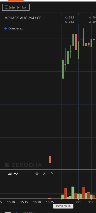 Todays 1 min candle start from 09:19 for MPHASIS25AUG2943CE.