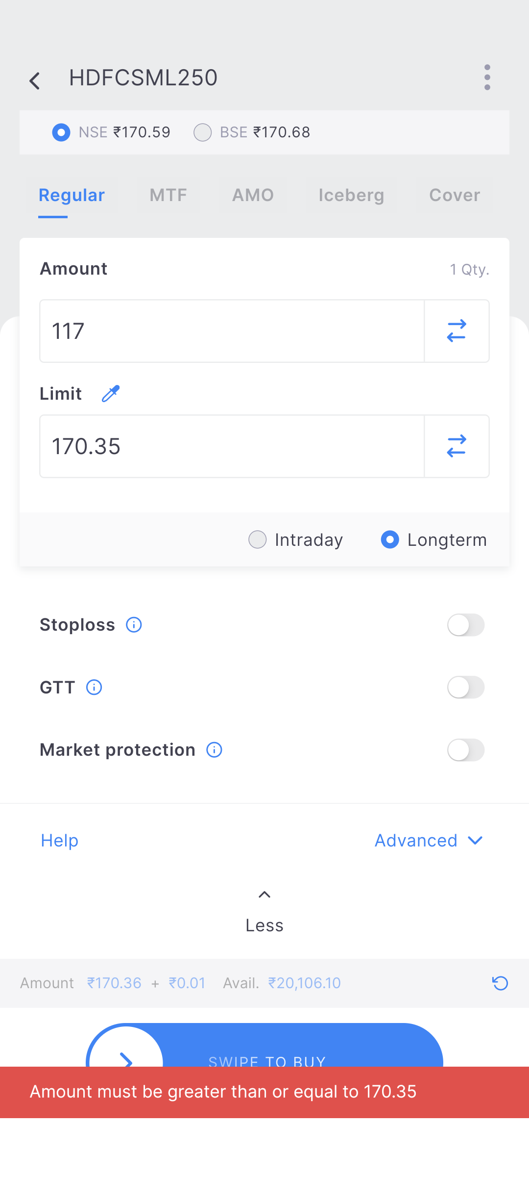The stock price is around ₹170, but you’re trying to buy it with ₹117. Switch from Amount to Quantity using the icon shown in the screenshot. Then, enter the number of shares you want to buy, and you’re good to go