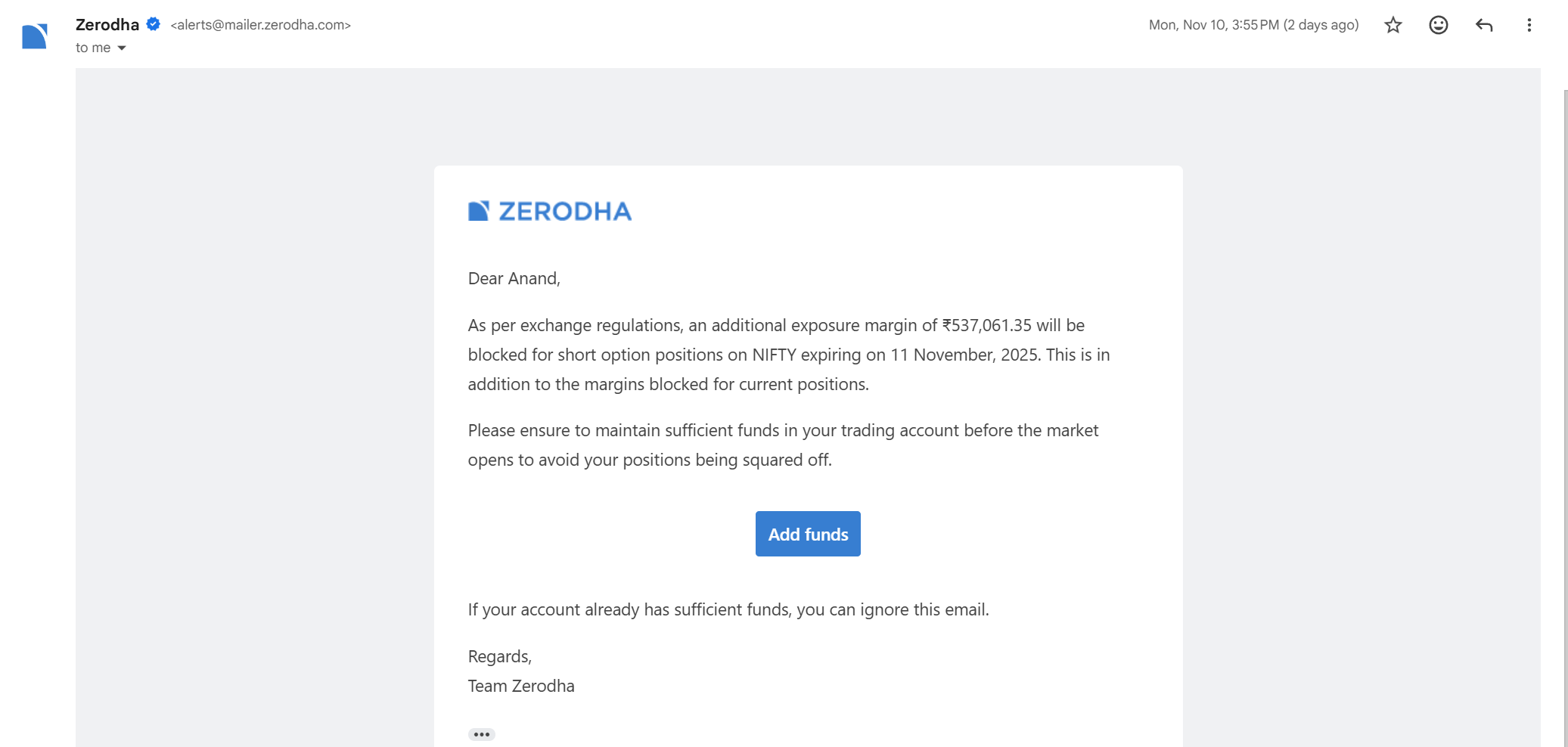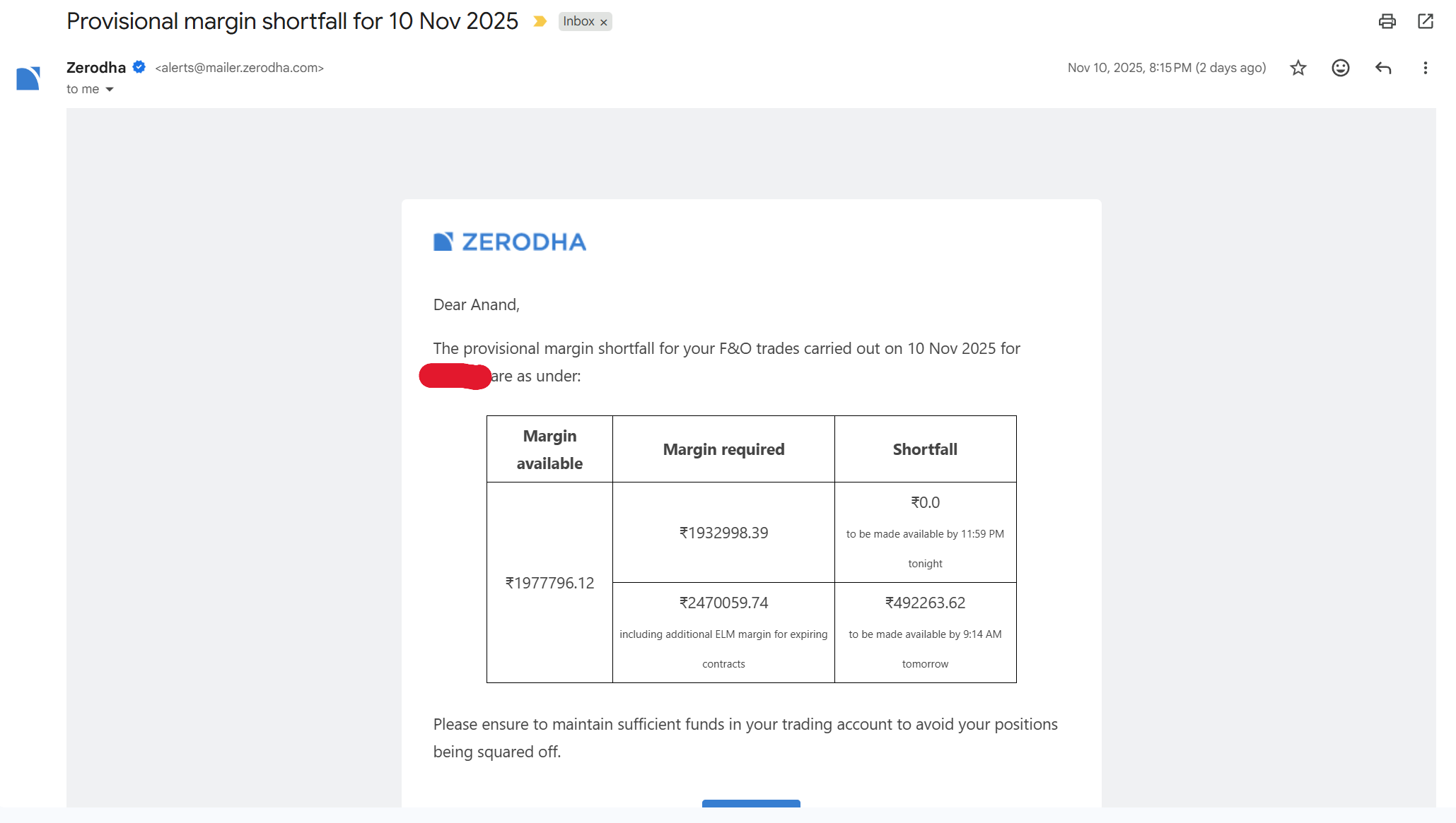 Same message send to me ,zero shortfall message in first row and den add 2 percent elm in second row,why zerodha is adding 2 percent elm margin on 1 DTE ,dis is confusing,