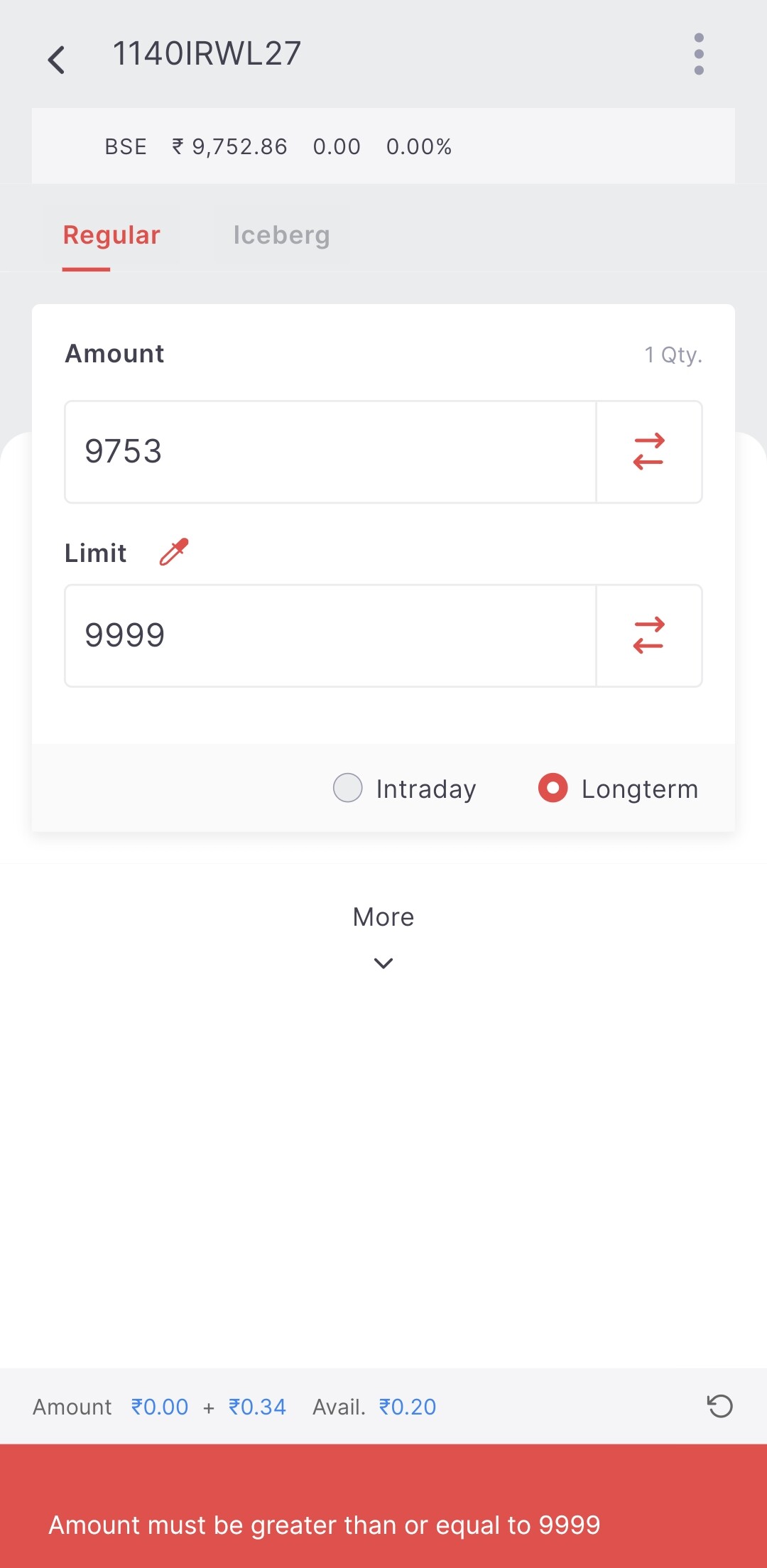 I think the error is because the entered amount is less than the limit price. Here, you want to buy the stock with ₹9753 (which equals 1 quantity), but your limit price is ₹9999, which is higher than the amount you entered. Try entering an amount greater than ₹9999.